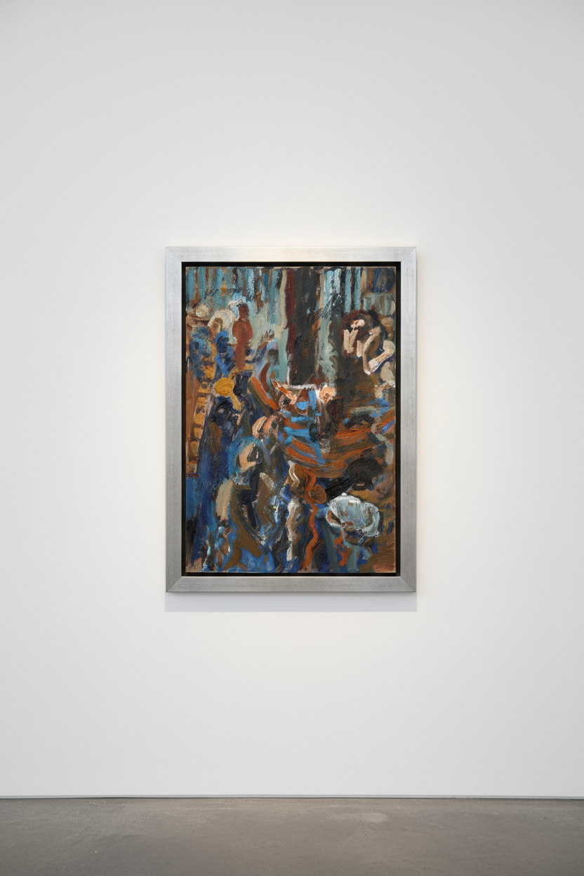 In Chess Tournament, Zebedee Jones captures the concentrated atmosphere of a competitive encounter through sweeping, gestural abstraction. Figures, tables, and chessboards dissolve into rhythmic passages of blue, brown, and ochre, their forms intertwined within a dense, painterly field. The fluid strokes and layered impasto evoke both the tension and motion of thought — a visual analogue to strategic engagement. Painted on linen, the weave of the fabric subtly interacts with the surface, adding texture and depth to the composition. Jones transforms the quiet intensity of play into a dynamic study of observation, energy, and the poetics of mark-making.