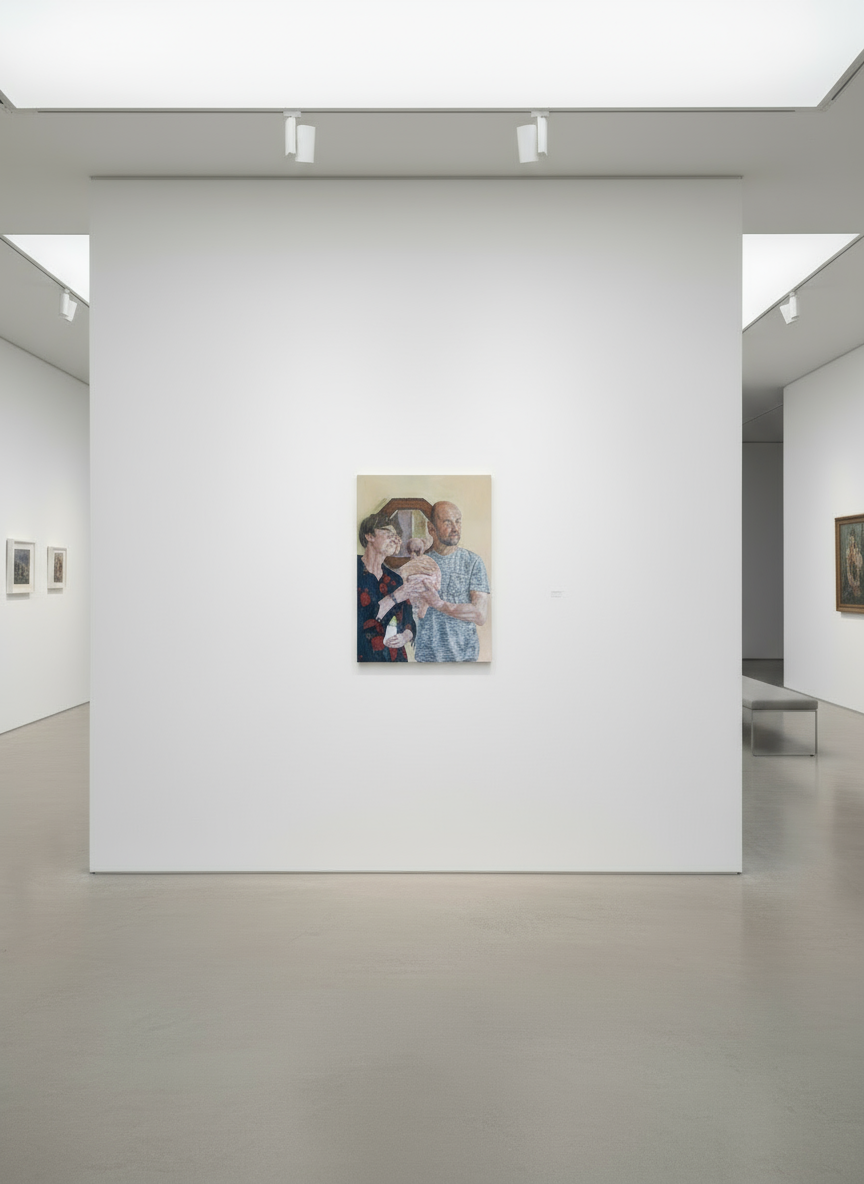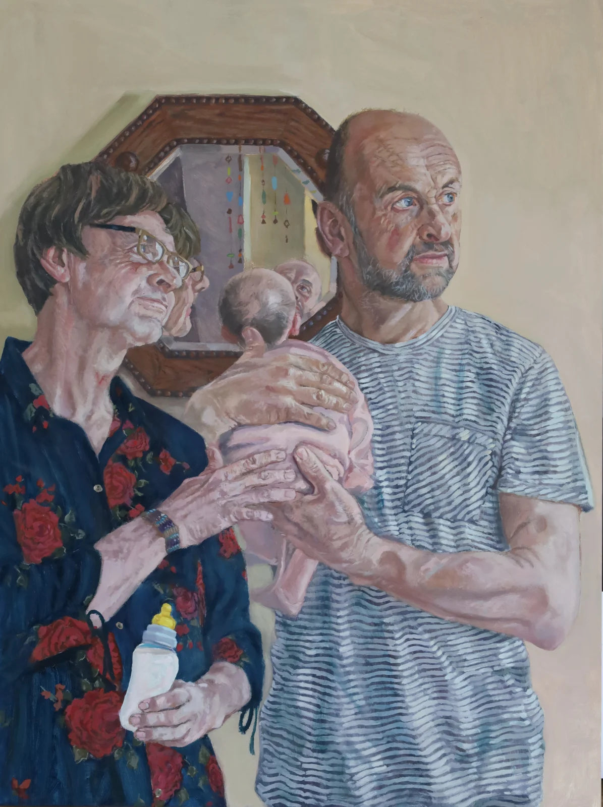 In Me, Myself and I, Howard Mason creates a deeply personal meditation on time, identity, and continuity. The painting depicts the artist in three stages of life — as infant, middle-aged man, and elder — woven together in a tender domestic scene. The baby, held between two adult figures, gazes toward a hexagonal mirror that reflects not only its own face but also the aged self it will one day become. This layered composition bridges generations within a single moment, suggesting both the fragility and permanence of selfhood. Mason’s meticulous realism and quiet emotional charge evoke the passage of time as something both intimate and universal — a reflection on life’s circular nature and the inevitability of becoming one’s own past, present, and future.